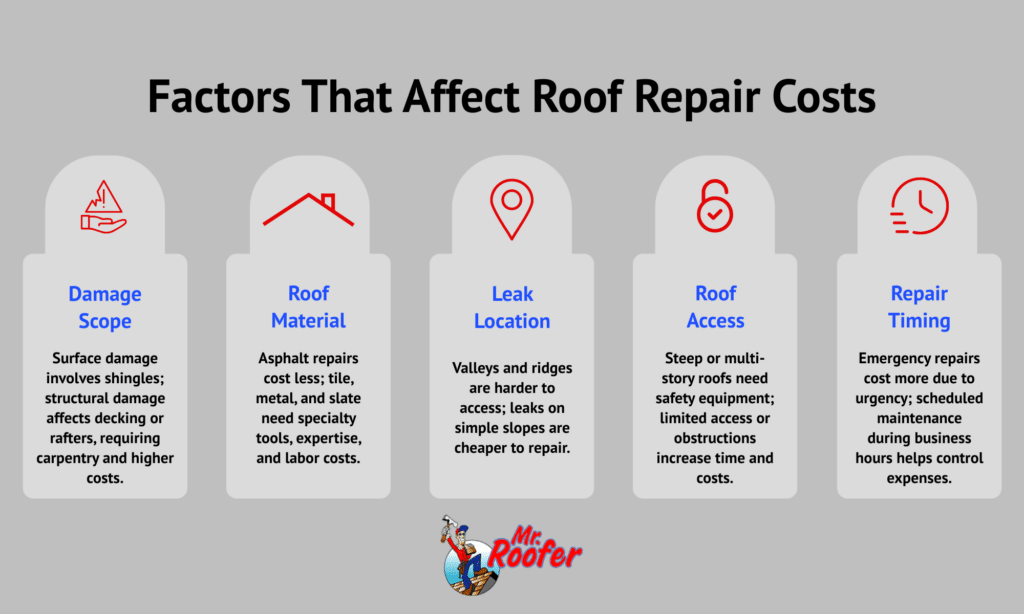 These ranges are general estimates. Your actual roof leak repair cost depends on your specific situation, including the type of leak, roof material, and extent of the damage.